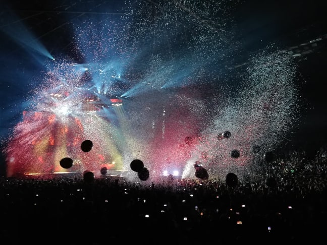 Sur le coup de 21h15, la température monte d’un cran lorsque retentissent Born To Raise Hell de Motörhead et Red Right Hand de Nick Cave. On y est, la soirée peut commencer. C’est Michael Poulsen, chanteur de Volbeat, qui arrive le premier et entame d’emblée Lola Montez, un des tubes du groupe. C’est ainsi qu’a commencé un concert de deux heures, rempli de générosité, de puissance et show. Il n’y a pas à dire, ils sont forts ces Danois et ils arrivent à se hisser parmi les plus grands groupes de rock contemporains avec des mises en scène impressionnantes tant sur le plan des lumières que sur le show en lui-même (canons de fumée, confettis, ballons géants…).